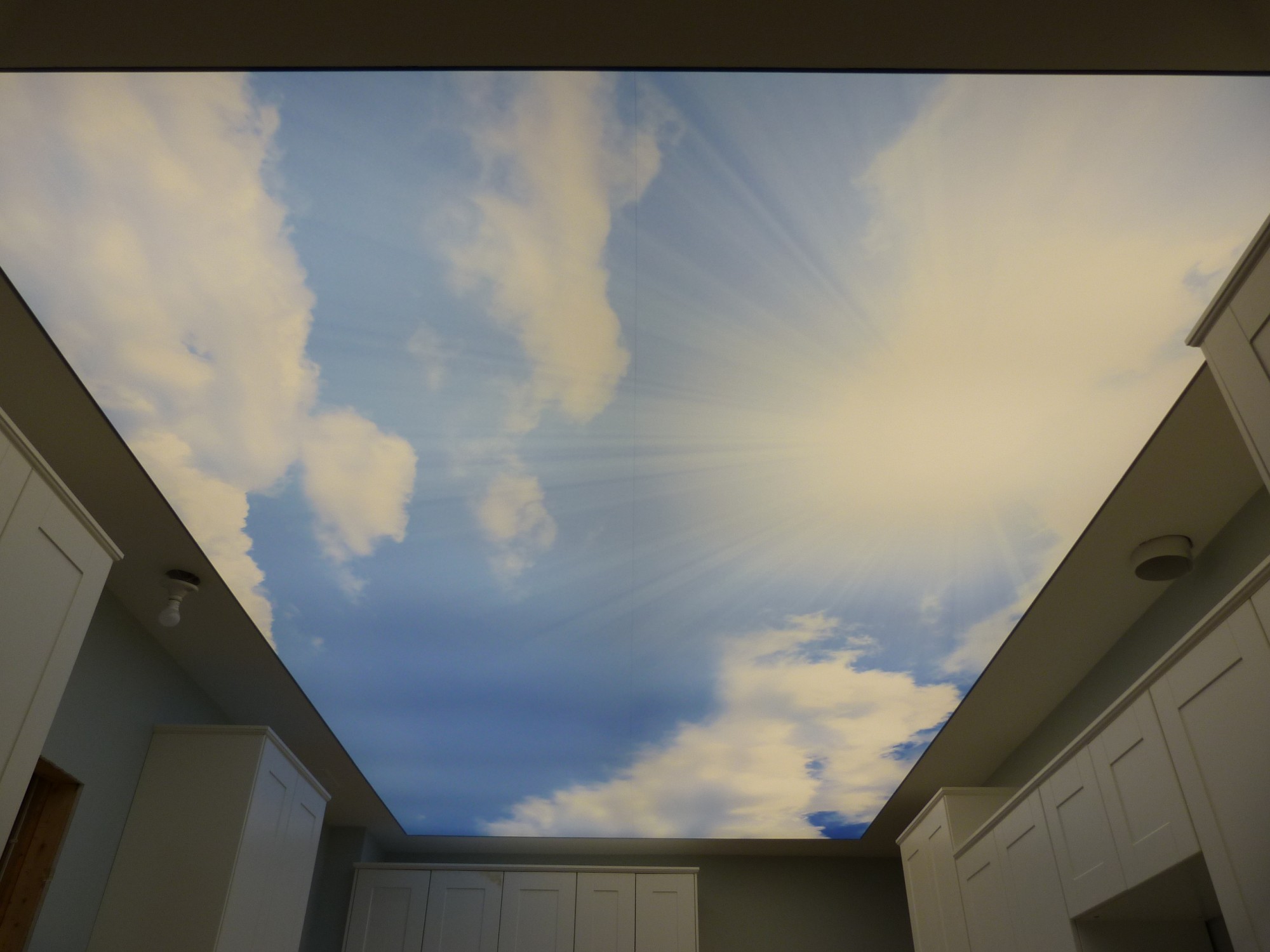 Below in advance an image of a recent project, an illuminated ceiling with custom imprint for a kitchen without any natural light – isn’t it pretty!